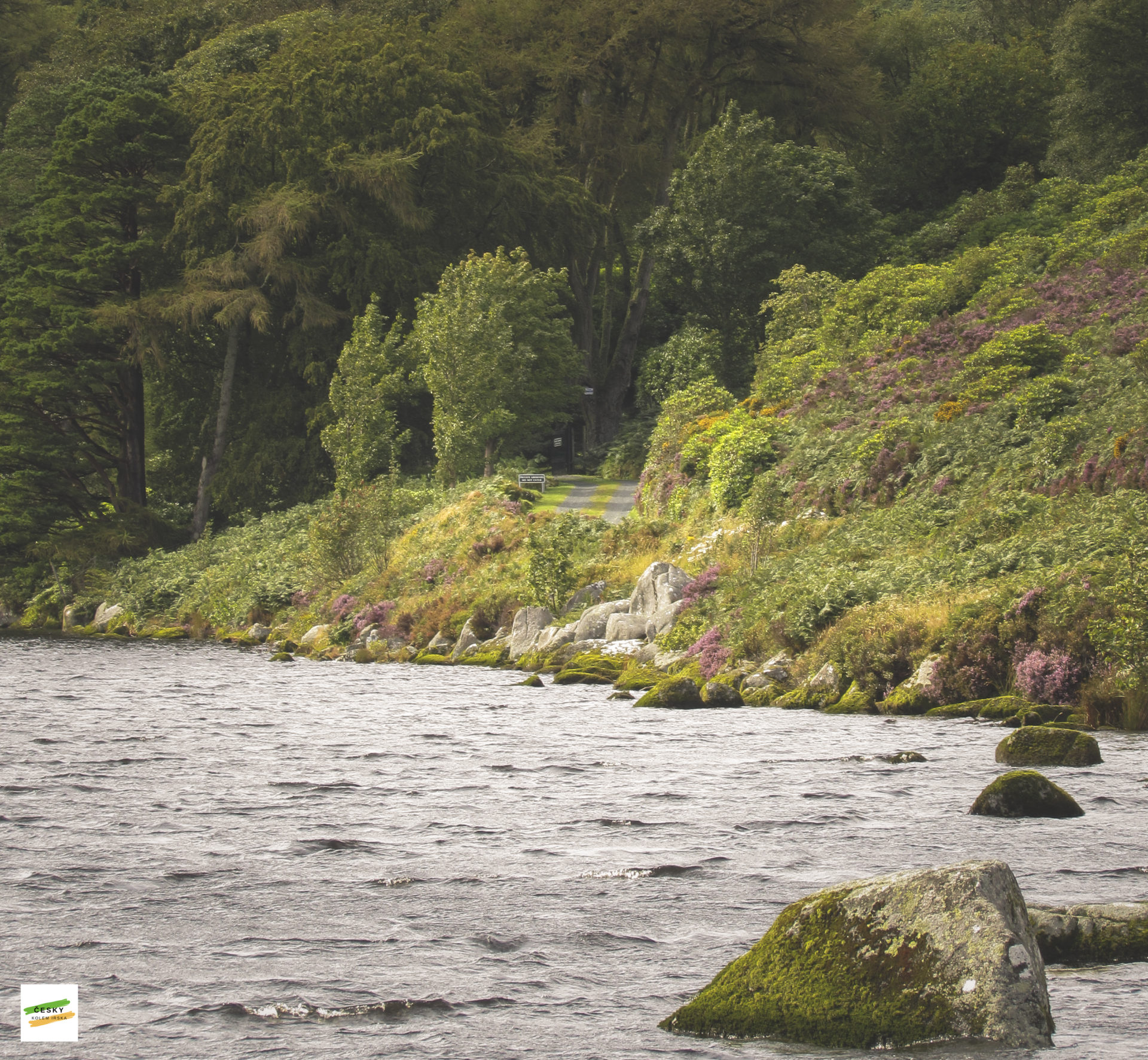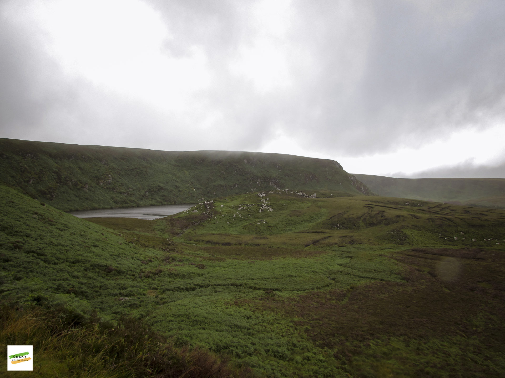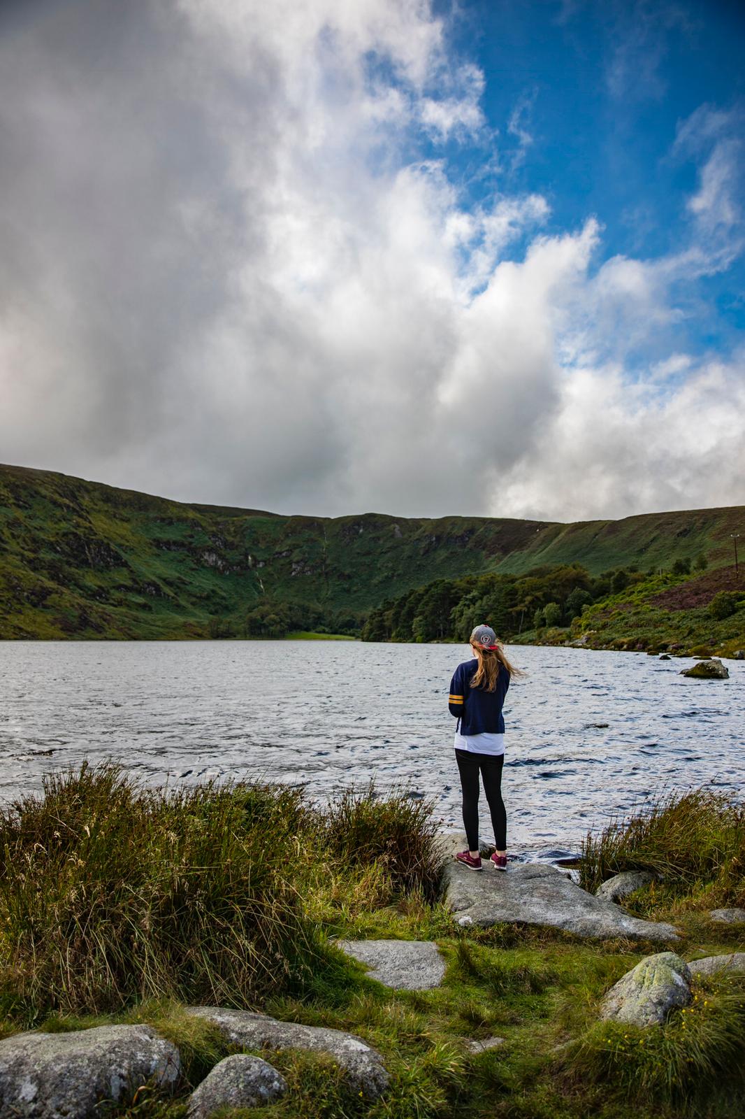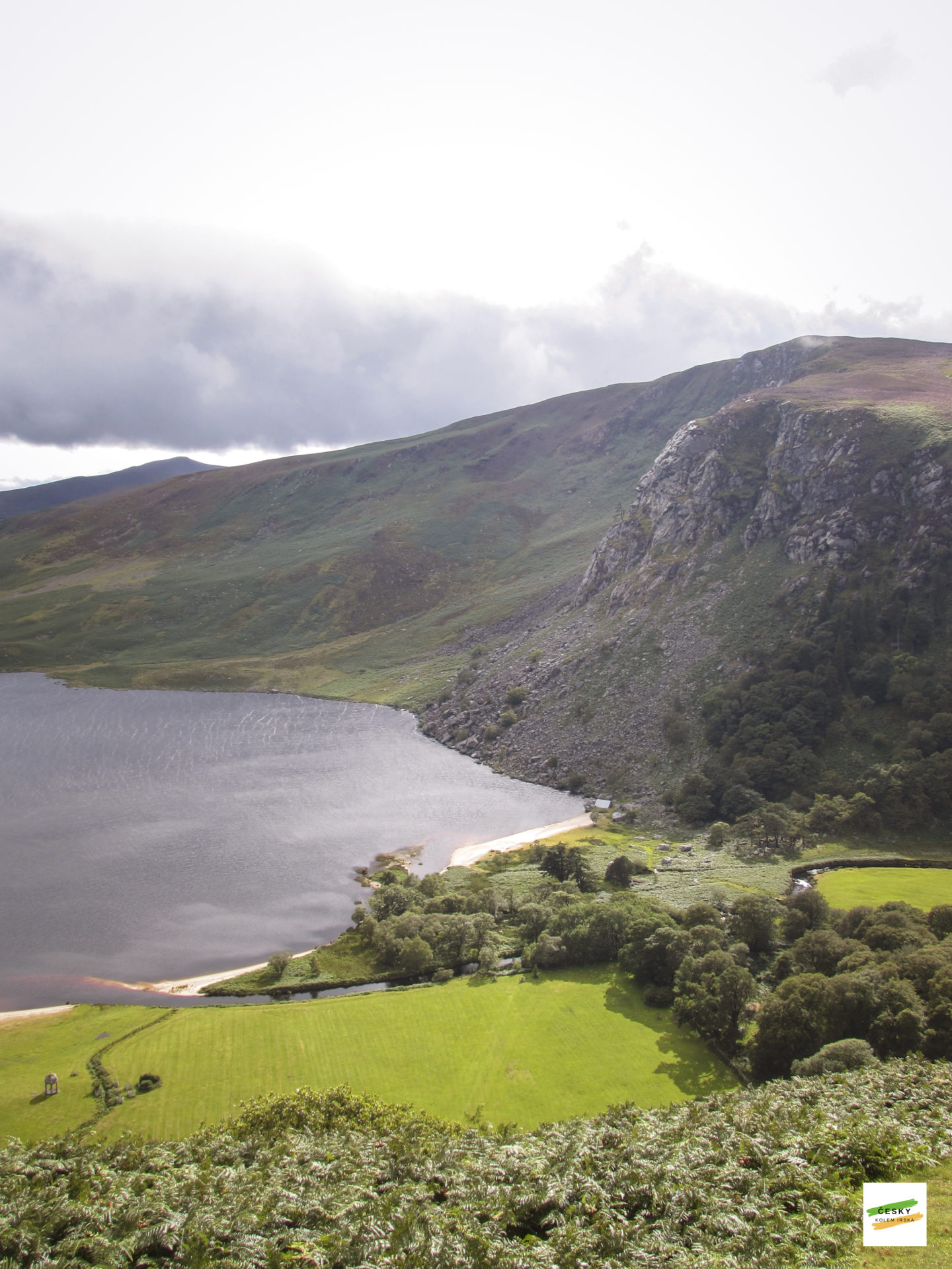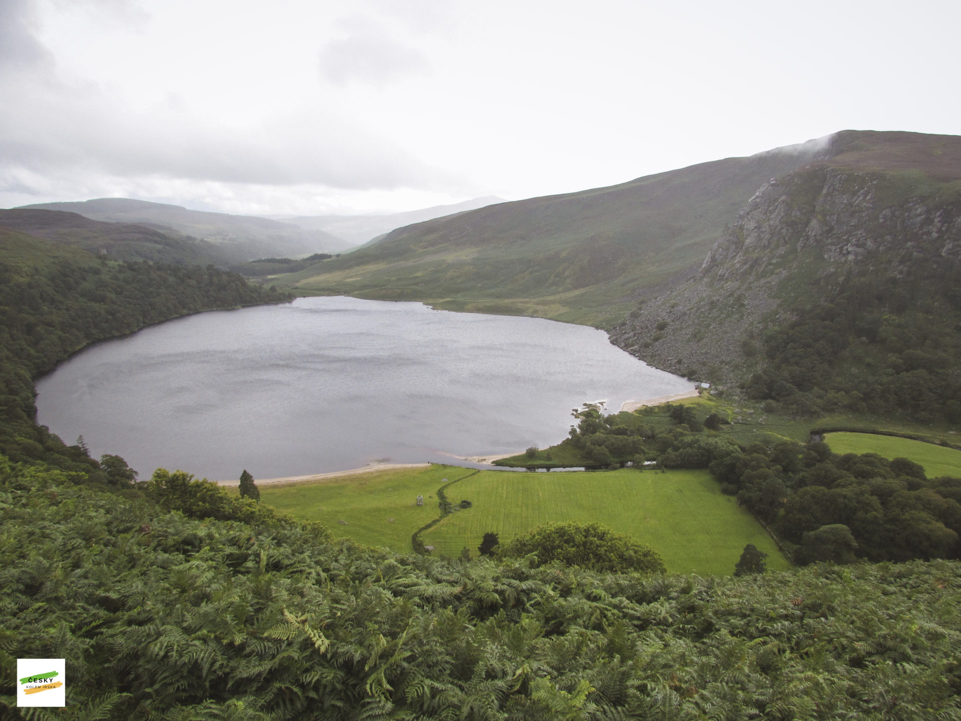 Za zmíňku nicméně stojí Lough Tay. Nejznámější jezero ve Wicklow horách, také přezdívané Guinness Lake. I když tak tmavé mi nepřišlo. My na něj koukaly ze dvou stran – z té první jsme měly lepší výhled a míň tam foukalo. Ze druhé, turisty oblíbené strany, jsem vyfotila jen jednu fotku, protože tam tak foukalo, že mě E. musela podepírat.