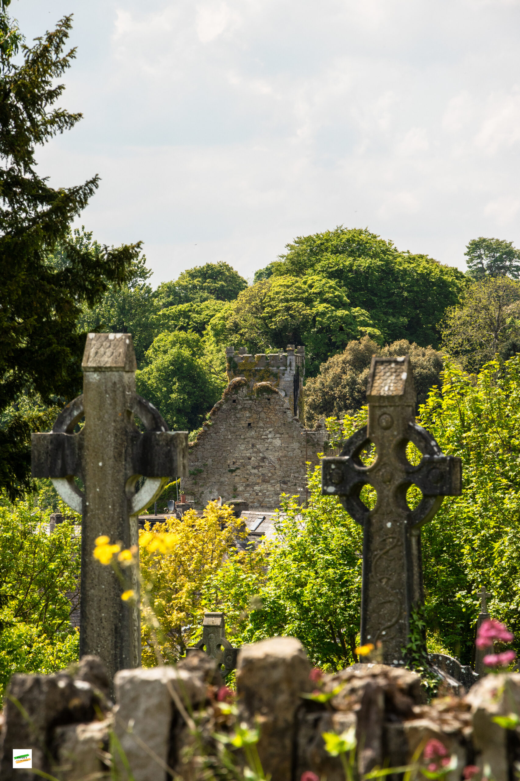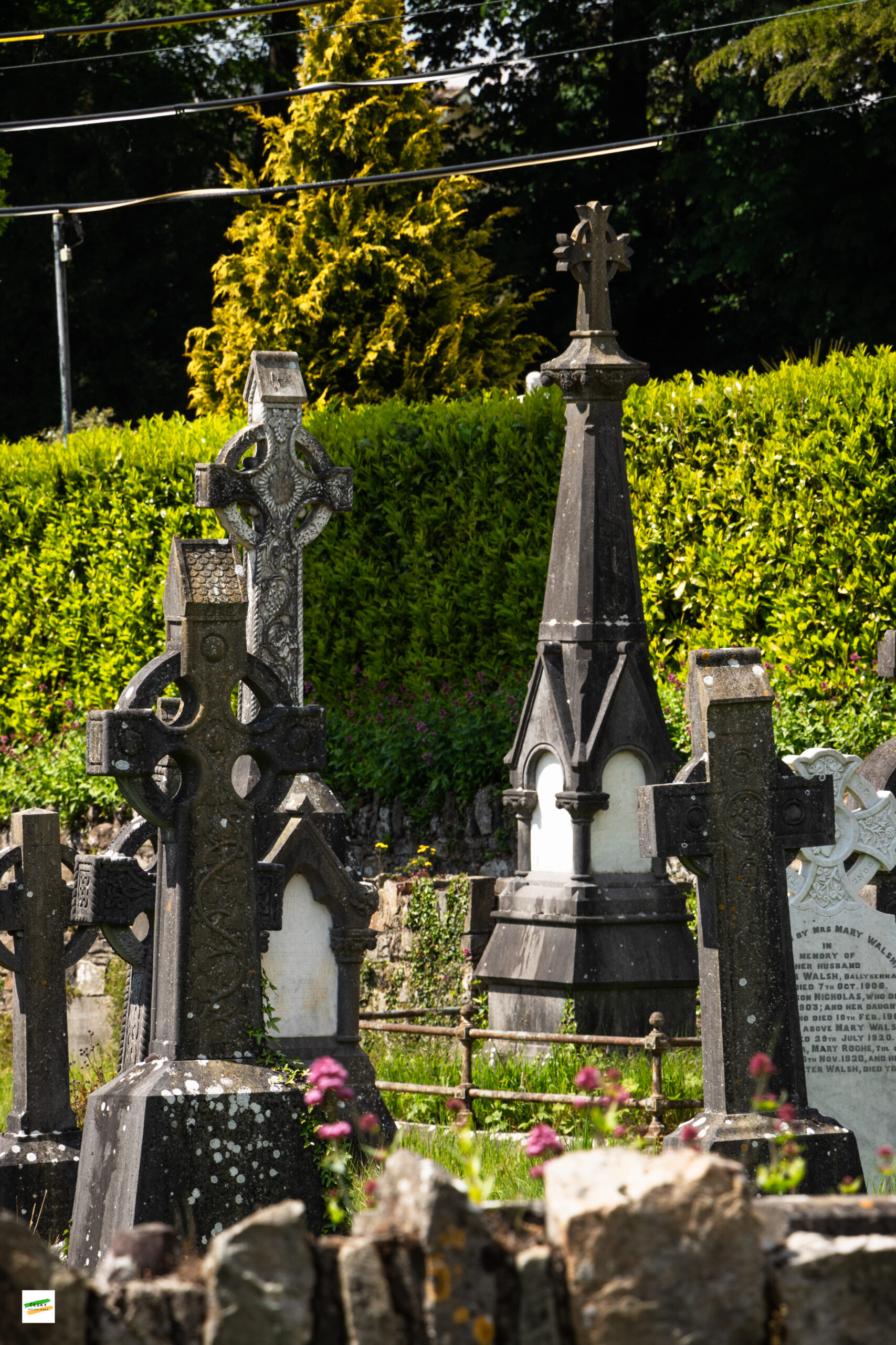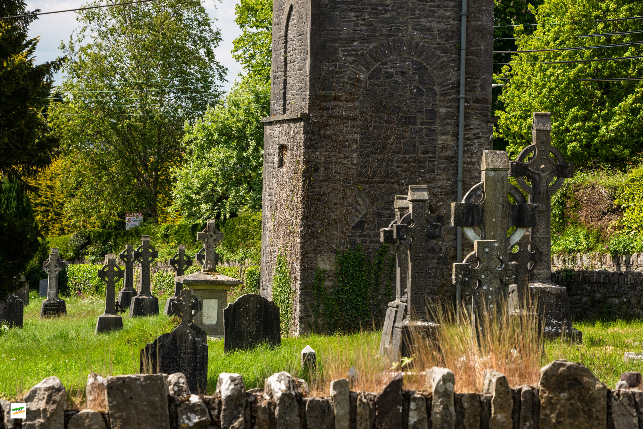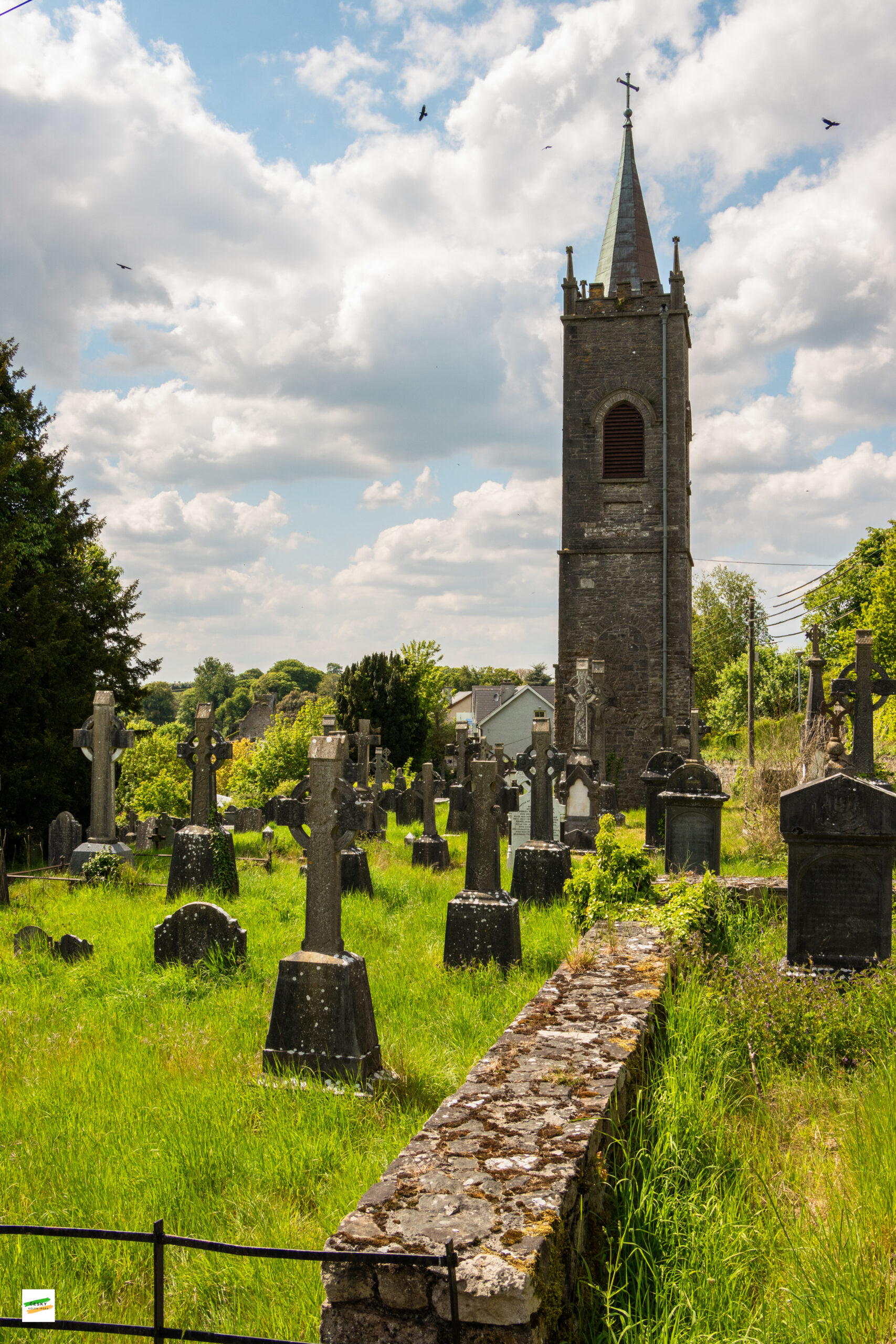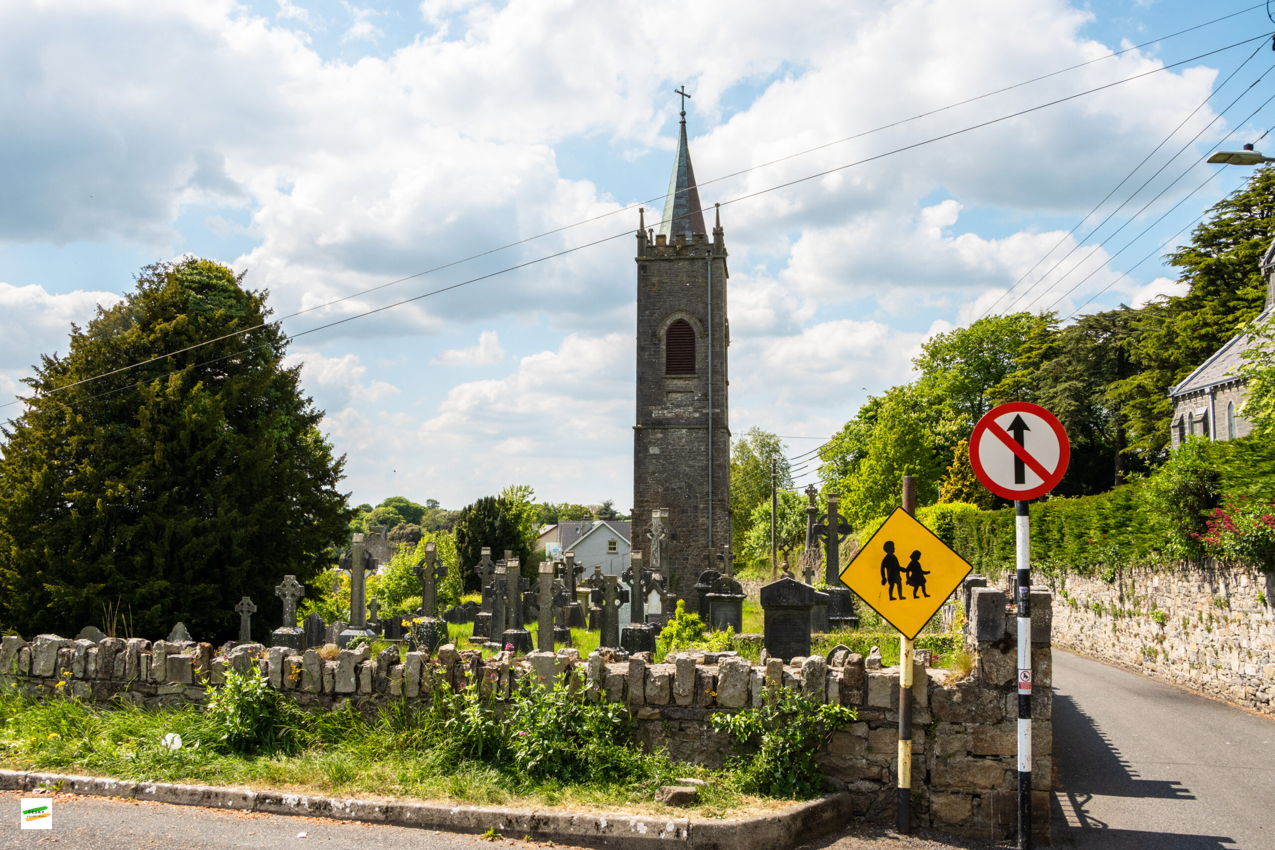 Right at the entrance to the village you can notice colorful buildings on both sides such as the Community Center or the Concert Hall. This path will take you straight to the center of Thomastown, where it is teeming with cafes and shops. At the end of the main road, behind a locked gate, is the first stop – the ruins of a church, probably. Even though this building is not open to the public, if you walk down this road to the other end and look back, it is beautifully highlighted by the shops and buildings around it. From here I headed to the Church Of The Assumption, not only because it is photogenic, but in front of it is an old tower and a cemetery with iconic Irish/Celtic crosses.